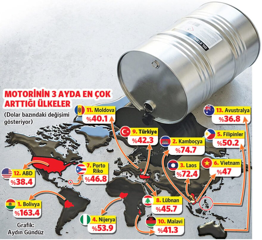 Türkiye, enflasyon oranlarında olduğu gibi akaryakıt fiyatlarındaki artışta da dünya genelinde dikkat çekici bir konumda bulunuyor. Son üç ay içerisinde dolar bazında benzin fiyatları yüzde 18, motorin fiyatları ise yüzde 42 oranında artış göstermiştir. Motorin fiyatlarındaki yükselişle Türkiye, dünya genelinde en yüksek artışın yaşandığı ilk 10 ülke arasında yer alırken, benzin zamlarında ise 20. sırada konumlanmıştır.